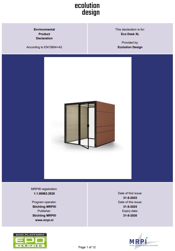 A focus pod designed to create a quiet and enclosed workspace for individual tasks. All Pods of Ecolution Design use interchangeable standard components, allowing easy addition, modification, merging, or splitting of configurations. This EPD represents one specific configuration: Eco Desk XL, having a front and backside with fully glass windows. Most materials are sourced from post-consumer and post-industrial waste streams, following circular economy principles