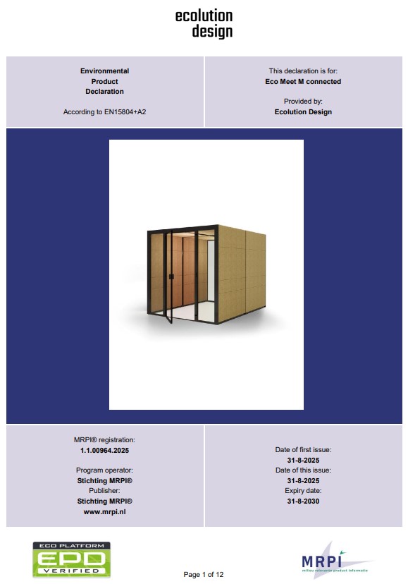 A meeting pod designed to provide a quiet, enclosed workspace for individuals or groups. All Pods of Ecolution Design use interchangeable standard components, allowing easy addition, modification, merging, or splitting of configurations. This EPD represents one specific configuration: Eco Meet M connected, having a front and backside with fully glass windows. Most materials are sourced from post-consumer and post-industrial waste streams, following circular economy principles.