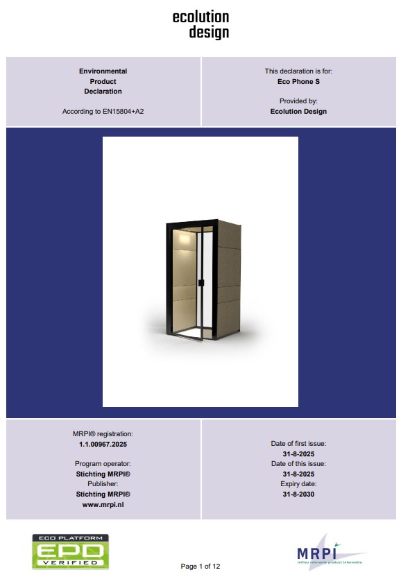 A focus pod designed to create a quiet and enclosed workspace for individual tasks. All Pods of Ecolution Design use interchangeable standard components, allowing easy addition, modification, merging, or splitting of configurations. This EPD represents one specific configuration: Eco Phone S, having a front and backside with fully glass windows. Most materials are sourced from post-consumer and post-industrial waste streams, following circular economy principles.