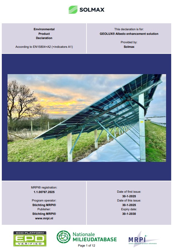 GEOLUX® provides a maximized level of Solar Energy Reflectance to increase the ground albedo to approximately 75%, resulting in an optimum increase in the power gained from bifacial solar panels.