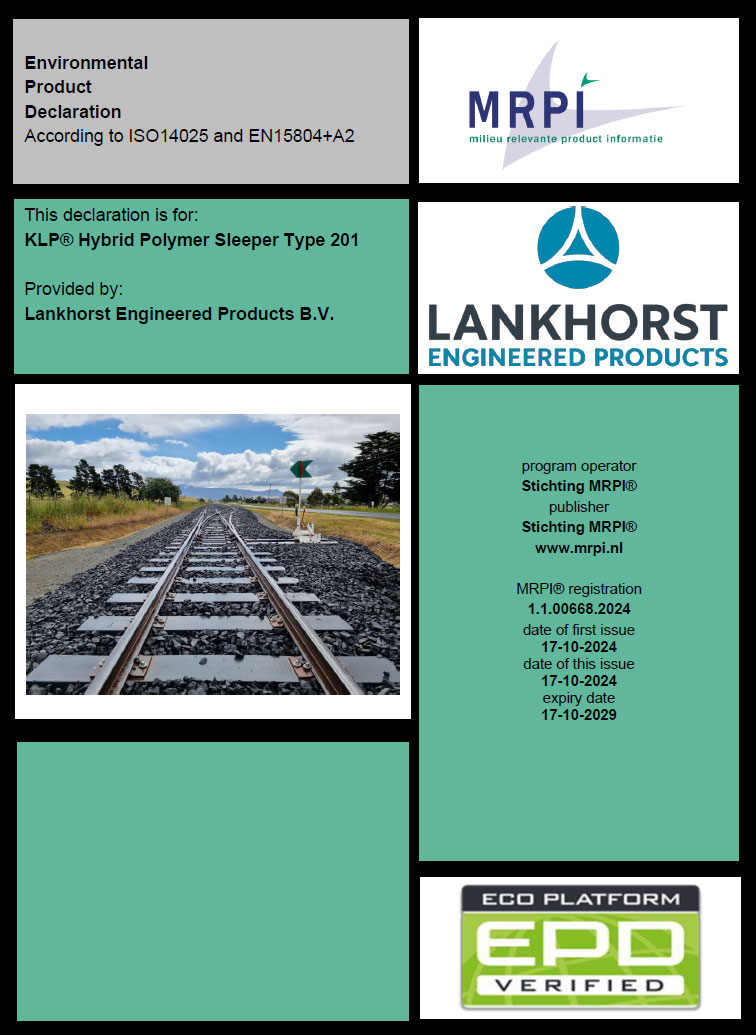The KLP® Hybrid Polymer Sleeper Type 201 is a 100% recycled polymer sleeper with steel rebar encased, suitable for installation in main track and switches and crossings. This sleeper is available in single lengths up to 5.2 metres.