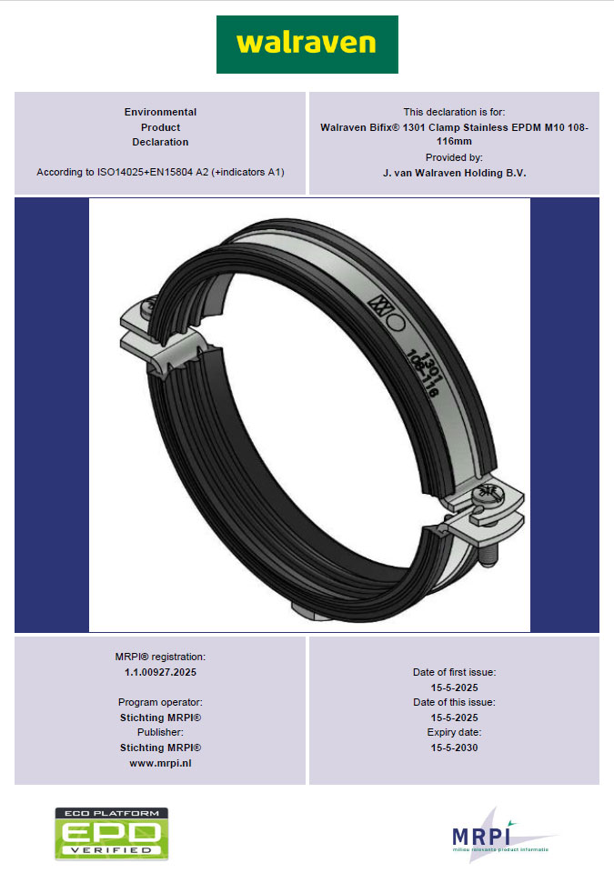 The Walraven Bifix® 1301 Clamp Stainless EPDM M10 108-116 mm is a durable two-screw pipe clamp made from stainless steel 1.4404 (AISI 316L) for high corrosion resistance. It features a quick locking system and a black EPDM lining for noise and vibration reduction according to DIN 4109