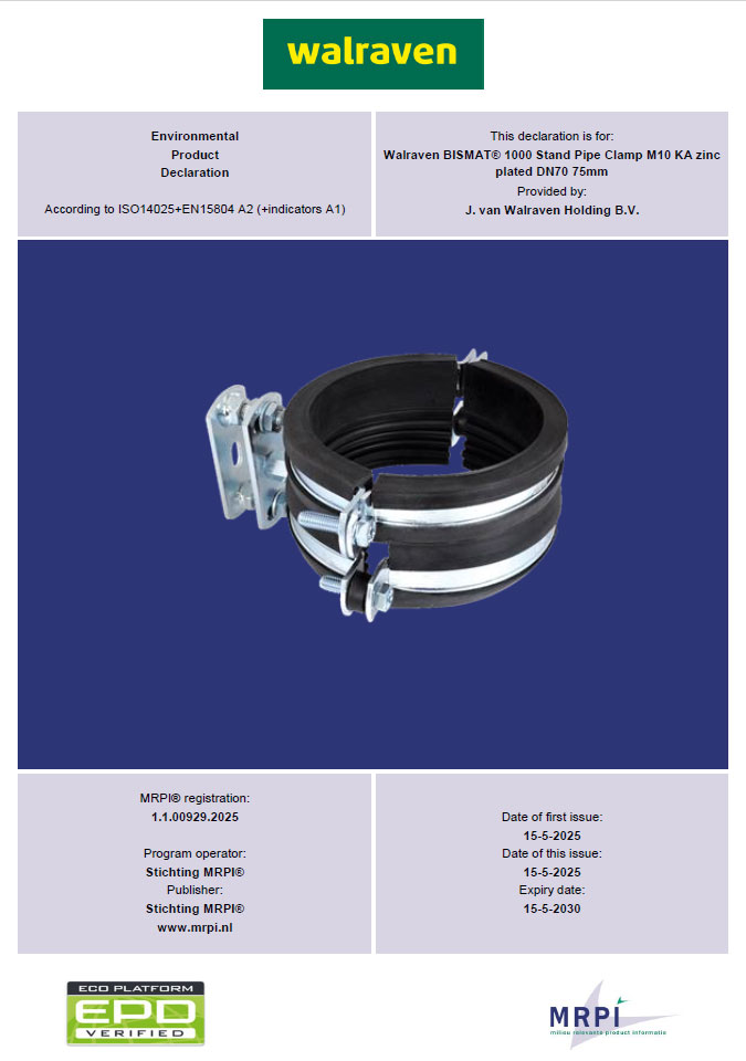The Walraven BISMAT® 1000 Stand Pipe Clamp M10 KA zinc plated DN70 75mm is a complete set with an adjustable wall plate, Walraven BISMAT® SL Guidance clamp, and BISMAT® SX Socket clamp. Designed for cast iron or plastic stand pipes, it allows tension-free fixing with infinite adjustment and adjustable pipe-to-wall distance. Suitable for mounting every second floor (every floor from Ø125 mm), it is made of zinc-plated steel and offers noise insulation exceeding DIN 4109 standards.